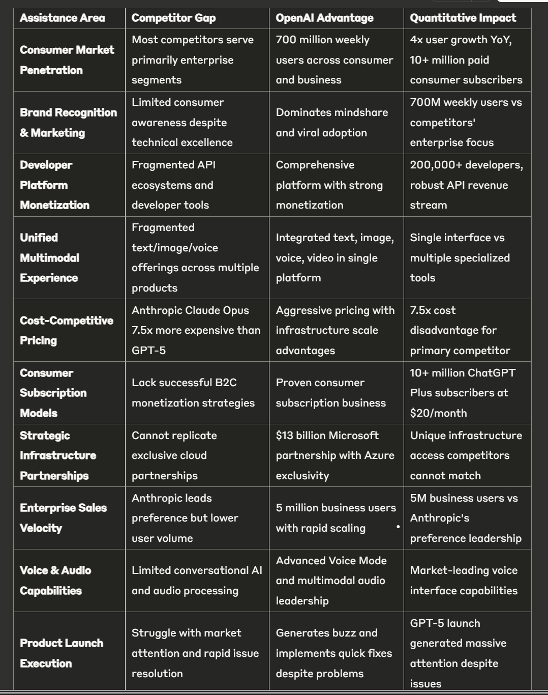 Innovation velocity metrics show quarterly model updates with measurable capability improvements, 8-week average time from research breakthrough to product integration, patent portfolio exceeding 200 applications covering transformer architectures and training methodologies, and R&D spending representing 19% of revenue compared to 12-15% industry average for enterprise software companies. Patent portfolio includes foundational transformer improvements, training efficiency optimizations, safety alignment techniques, and multimodal fusion architectures, though the company has committed to sharing basic safety research publicly while maintaining competitive advantages in implementation and scale. Security and compliance standards encompass SOC 2 Type II certification, ISO 27001 information security management, GDPR compliance for European operations, HIPAA eligibility for healthcare applications, and FedRAMP compliance pathway for U.S. government deployments including the $200 million Department of Defense contract. Platform competitors include Google Bard/Gemini (integrated across Google Workspace, 500 million monthly users), Microsoft Copilot (365 million Office users, $30 billion revenue run rate), Amazon Bedrock (serving AWS enterprise customers), Salesforce Einstein (embedded across CRM platform), Adobe Creative Cloud AI (serving 26 million subscribers), IBM Watson (enterprise focus), Meta AI (3 billion social media users), Apple Intelligence (1 billion device users), Anthropic Claude (preferred by 32% of enterprises), Cohere (enterprise API focus), AI21 Labs (multilingual specialization), Stability AI (open-source image generation), Midjourney (creative professionals), and Character.AI (conversational AI for consumers). Pure-play competitors comprise Anthropic ($850 million ARR growing 300% annually with strong enterprise preference for coding and reasoning tasks), Cohere ($35 million ARR with enterprise API focus and multilingual capabilities), AI21 Labs ($15 million ARR specializing in long-form content generation), Perplexity ($50 million ARR with search-integrated approach), xAI ($100 million ARR backed by Elon Musk with real-time data integration), Inflection AI (enterprise-focused with data security emphasis), and emerging players like Mistral AI, Together AI, and Fireworks AI offering competitive pricing and specialized deployment options. Competitive moat sustainability depends on maintaining model performance leadership (currently challenged by Anthropic in enterprise coding tasks), preserving Microsoft partnership exclusivity (renegotiated January 2025 with IPO provisions), scaling infrastructure cost advantages through custom silicon development, and leveraging network effects from user-generated training data while navigating data privacy regulations and competitive positioning against integrated Big Tech offerings.
